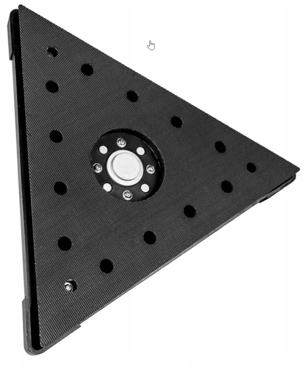 Принцип работы треугольной насадки для R7237A-CT прост: 3 мм эксцентриковый ход преобразует приводное движение в возвратно-поступательное, обеспечивая качественную шлифовку вдоль углов, полок, прилегающих участков декоративных элементов и шлифовку под покраску. Максимальная частота колебаний платформы составляет 6000 (в минуту). Размер треугольной шлифовальной площадки составляет 285 мм. Шлифовальная бумага крепится с помощью липучки.